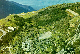 Here is an aerial shot to get you oriented. The big white splotch in the center is the theater; the rectangular structure to the left of it is the Temple of Apollo. The stadium is in the upper right, and the road to the modern town of Delphi is at the far left.