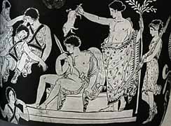 Purification for murder required the slaughter of a piglet over the polluted person's head. This vase painting depicts the purification of Orestes