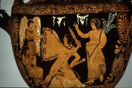 This red-figure vase in the Harvard University Museum dates from about 350-340 BCE. It depicts Orestes (middle) at Delphi, fending off the Erinyes (left) with the protection of Apollo (right).
