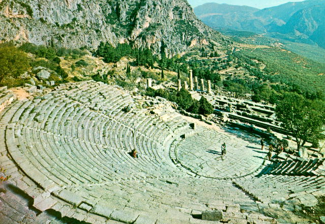 Below is the theater at Delphi as seen from above the top row of seats. Below the theater, in the middle of the photo, you can see six columns - the remains of the Temple of Apollo.