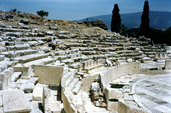The Theater of Dionysos in Athens. The right bottom of the photo is the orchestra floor; looking straight ahead and stretching to the left are the seats, complete with a lone audience member.