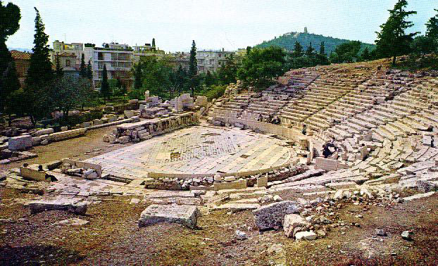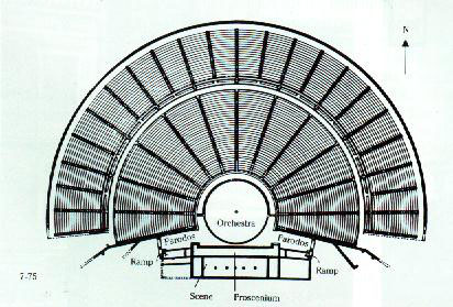 Above is plan for the theater at Epidauros, the largest extant theater on the Greek mainland. Notice the circular orchestra, in which the chorus would appear, surrounded by wedge-shaped banks of seats. Below is the Theater of Dionysos on the south slope of the Athenian acropolis.