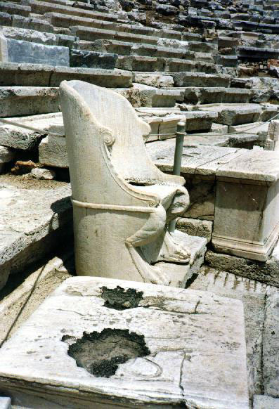 To the left you can see one of the carved stone seats in the front row of the theater. Such seats were reserved for VIPs such as the priest of Dionysos or one of the ten generals.