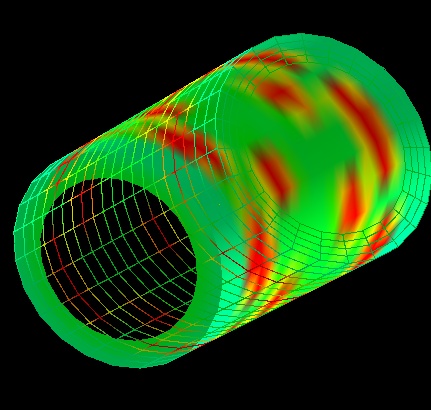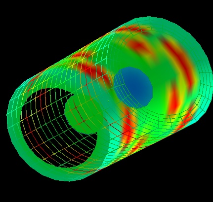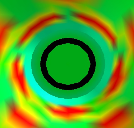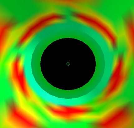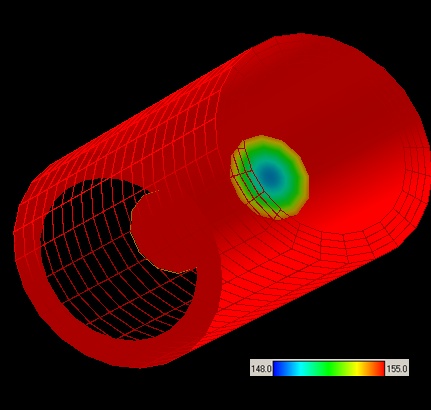 Finally, note that with the shields, the DANTE temperature is lowered, as the back, cool side of the shield has a significant view factor. Coincidentally, the DANTE temperatures are very similar to that on the sample at TCC (see the table above). The back of the shield has a temperature of about 150 eV (compared to roughly 190 eV for barrel wall areas whose views are projected near the edge of the shield - please let me know if you'd like a demo version of the view-factor code to play around with so you can check the temperatures of various surfaces). Below we show a temperature map with a restricted temperature range, showing the temperature of the back of the shield and the gradient across the shield.